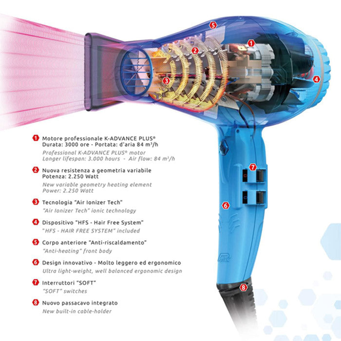 Phon professionale con tecnologia ionica, potenza 2250 watt e 3000 ore di durata.